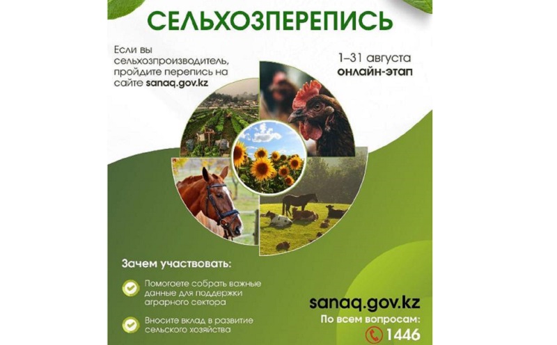 С 1 августа по всей территории Казахстана началась масштабная кампания по сбору данных в аграрной сфере. Национальная сельскохозяйственная перепись охватит свыше 300 тысяч аграрных формирований и приблизительно 2 миллиона домохозяйств. Это событие стало частью глобальной инициативы Продовольственной и сельскохозяйственной организации ООН, проходящей в рамках десятой Всемирной программы сельхозпереписей.