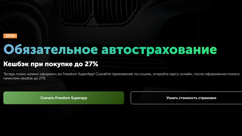 Сначала необходимо перейти на оформление огпо страховка фридом через мобильное приложение Freedom Superapp.  Далее при заполнении данных нужно указать промокод 5874FA. После завершения оплаты и выпуска полиса система начислит вам 1000 тенге кешбэка.